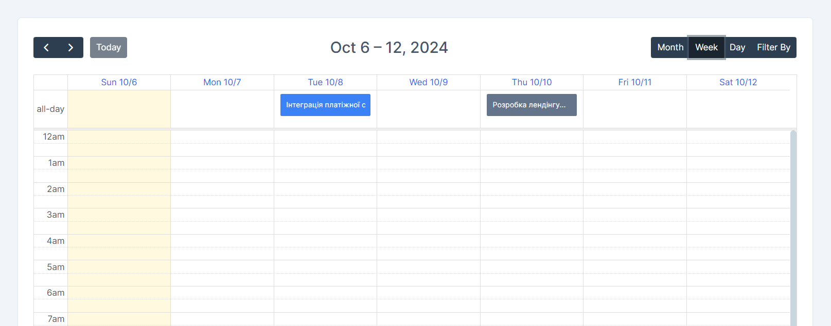 In Homex CRM system, you can conveniently view your tasks and events in weekly mode. This allows you to effectively plan your workflow, see all planned activities, and optimize your time. All tasks, appointments, and important events are displayed in a convenient format that allows you to instantly navigate your plans for the near future. With this tool, you'll always be one step ahead!