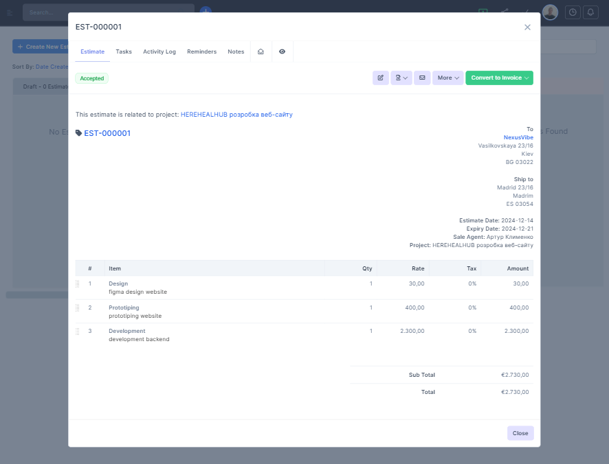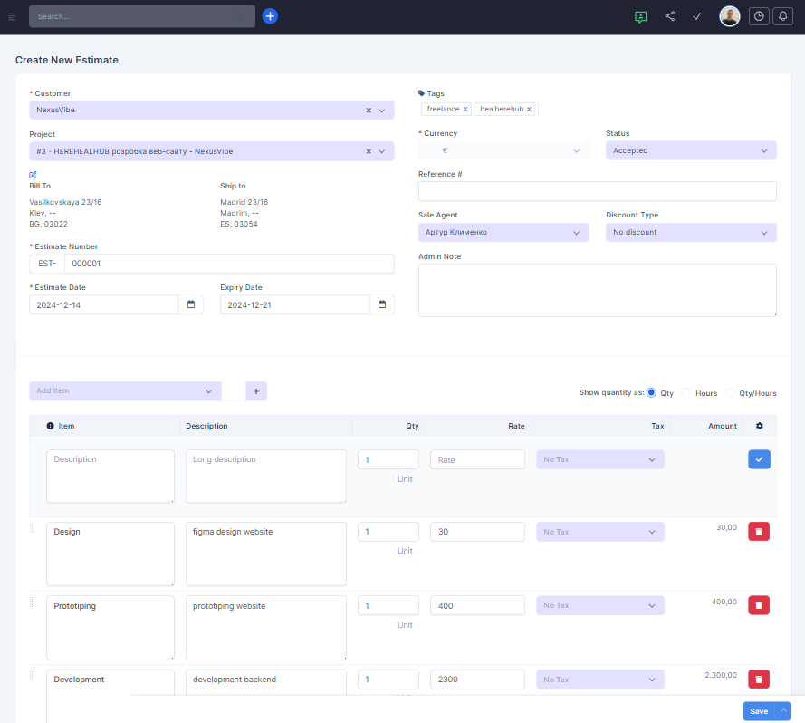 The finished estimate is displayed in a format that is easy to view and print. It is possible to export to PDF with customization of the design, adding a logo or manager's signature. Estimate statuses help you track the stages of work and quickly send the document to the client.