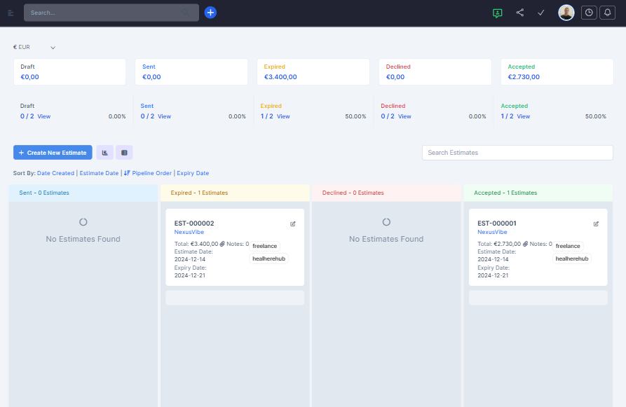 The interactive board visualizes all estimates by status: “Draft”, “Awaiting confirmation”, “Confirmed”. The user can easily move estimates between statuses using drag-and-drop. Kanban allows you to focus on priority tasks and not miss important milestones