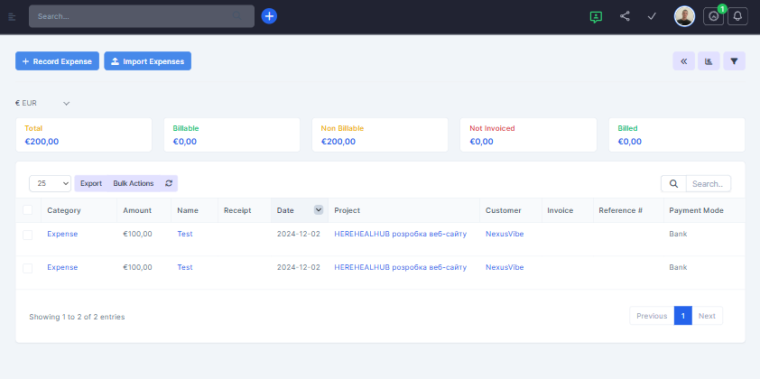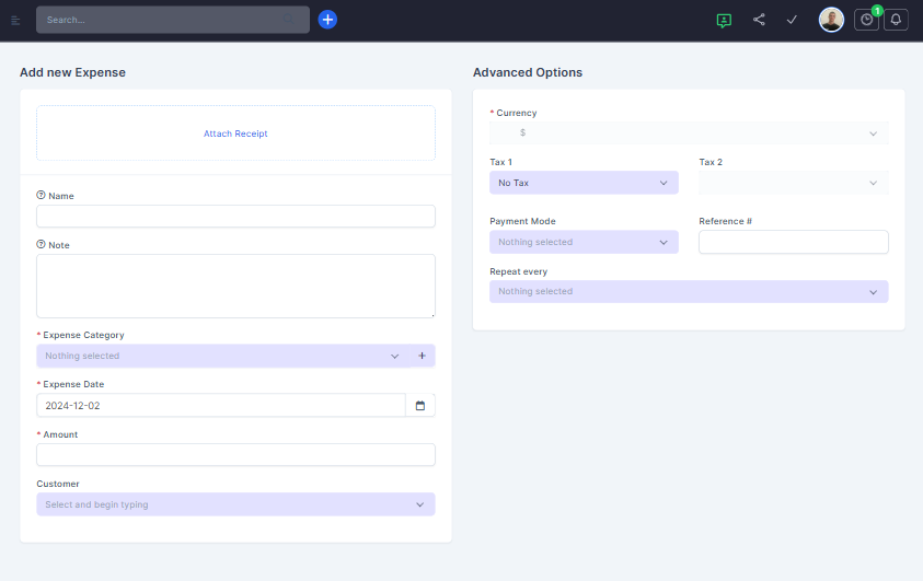 Adding new expenses has never been easier. The intuitive form allows you to enter all the necessary details, such as category, project, date, and amount, as well as attach files for additional evidence.