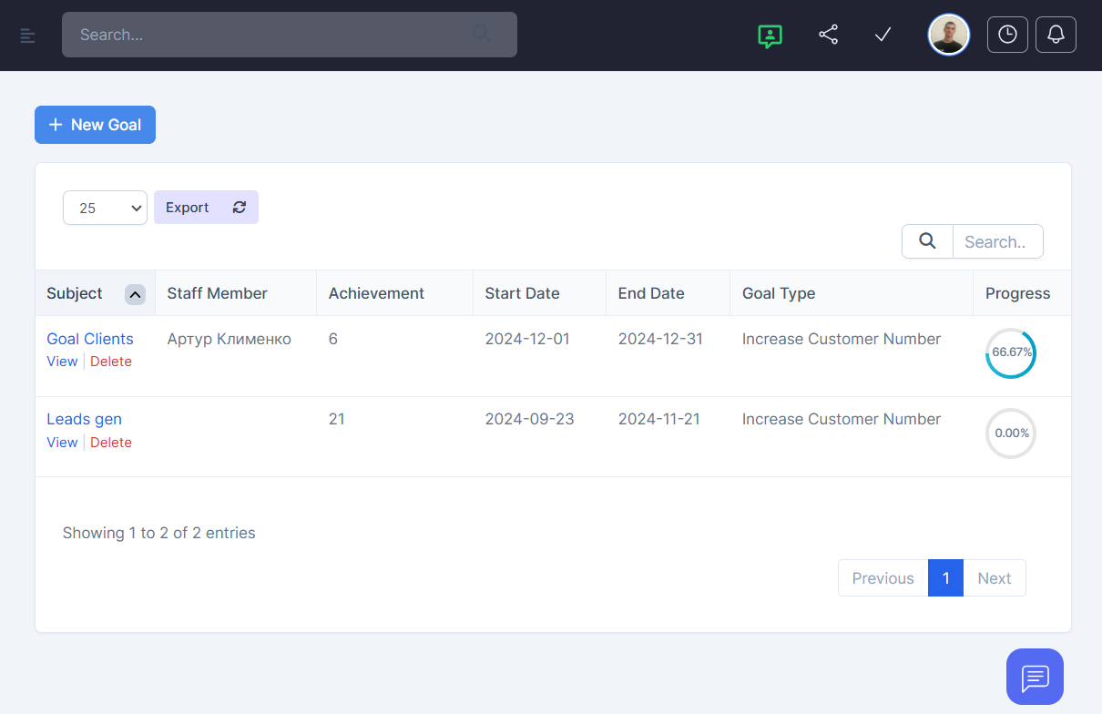 A handy table containing all active and completed goals. Includes fields such as goal name, responsible person, deadline, current progress (%), and status (active, completed, overdue). The functionality allows you to sort, filter, and view the details of each goal.