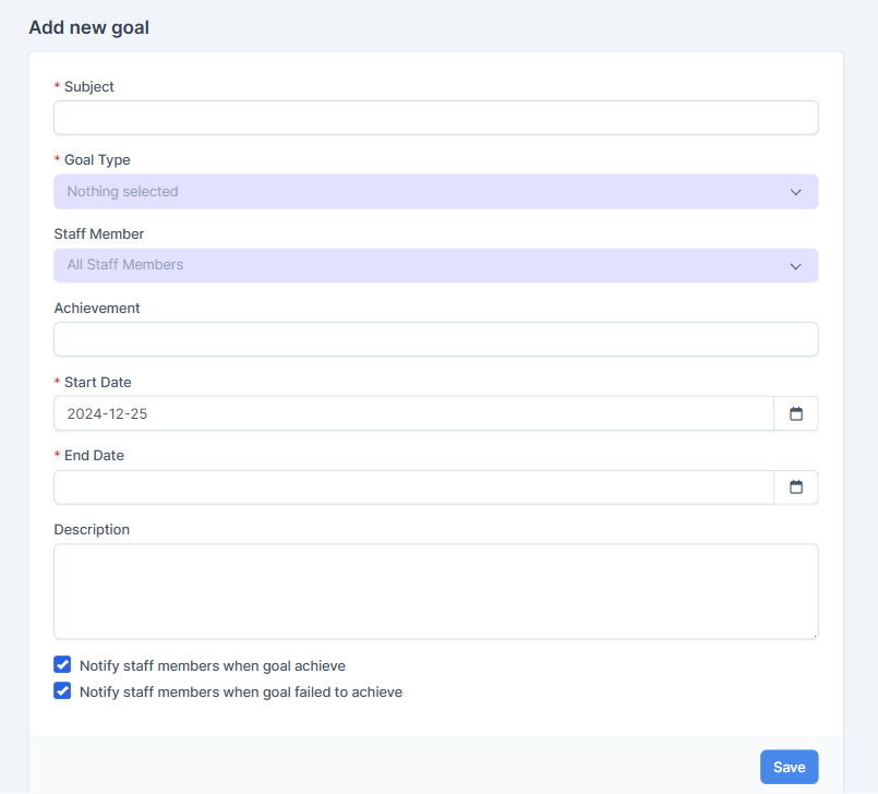 A form for creating new goals with flexible settings: name, description, responsible person, deadline, and expected result. Additionally, you can customize the stages of achievement and automatically update progress based on the results of completed tasks.