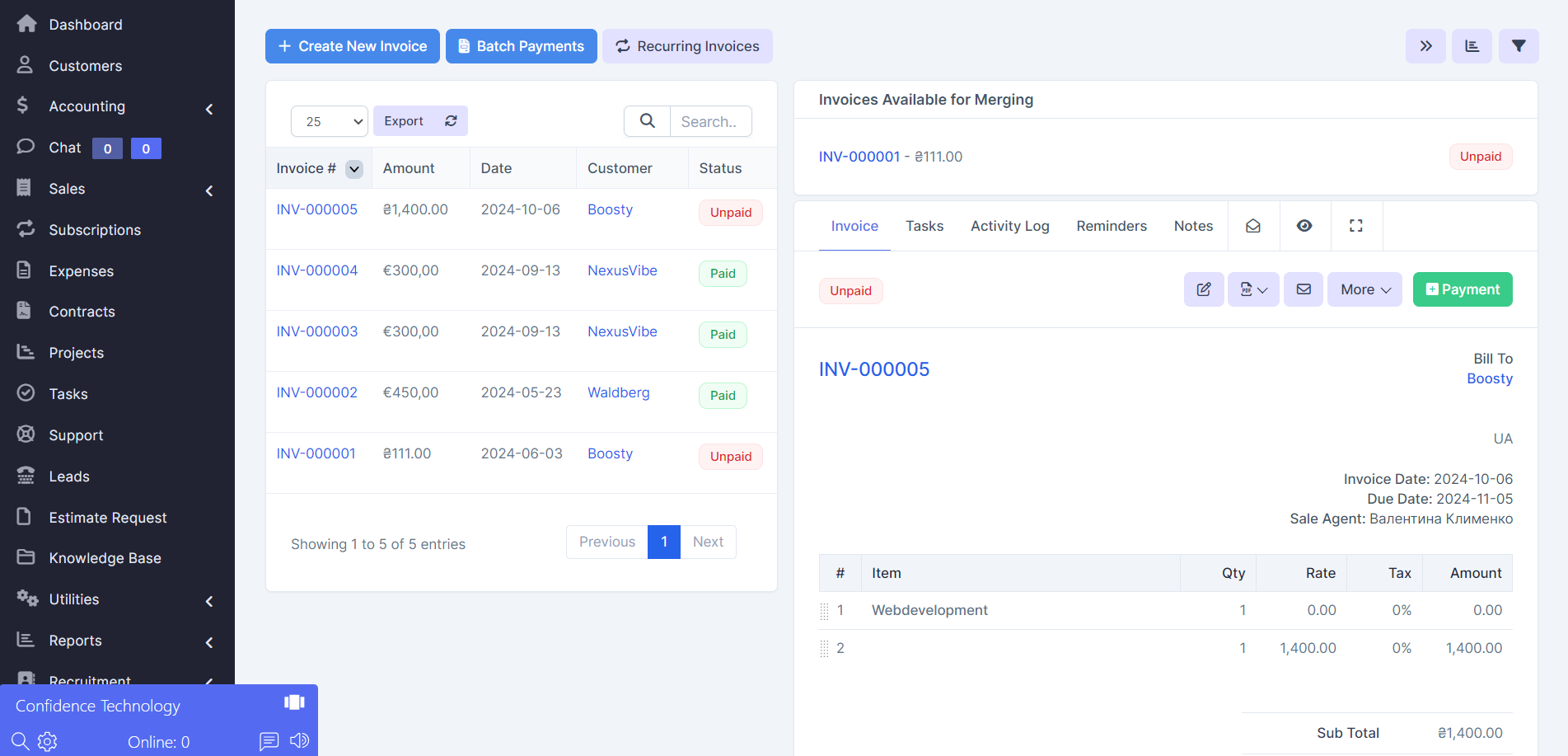 The client card includes a convenient panel for working with invoices, where all financial transactions are visible. You can easily track the status of invoices: paid, unpaid, or overdue, as well as get a complete history of mutual settlements. This allows you to quickly analyze the client's financial activity and keep everything under control without any extra effort.