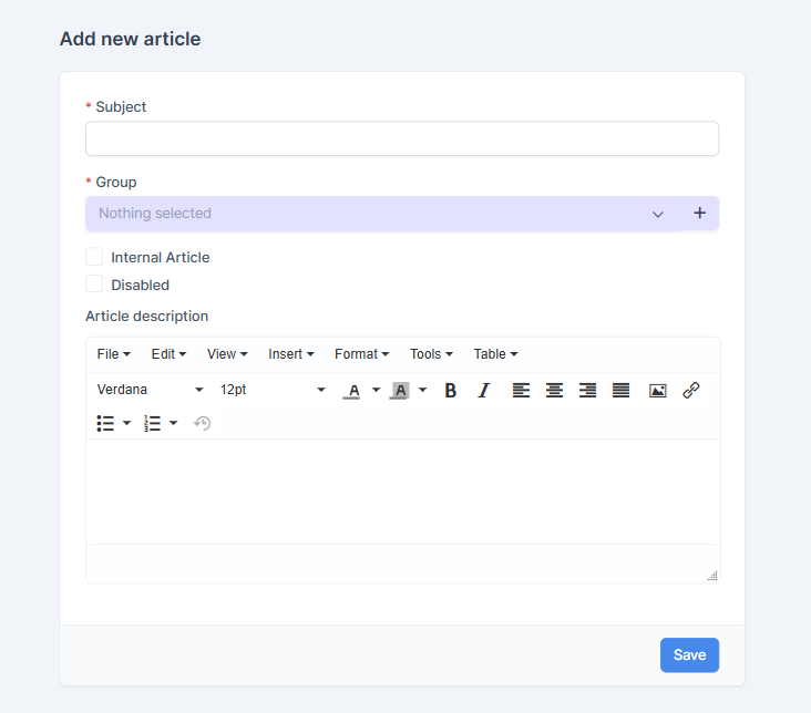 A tool for administrators or managers that allows them to create, edit, and publish articles in a knowledge base. Articles can include text, images, videos, or downloadable files. The system supports categorization of materials and tags for easy navigation.