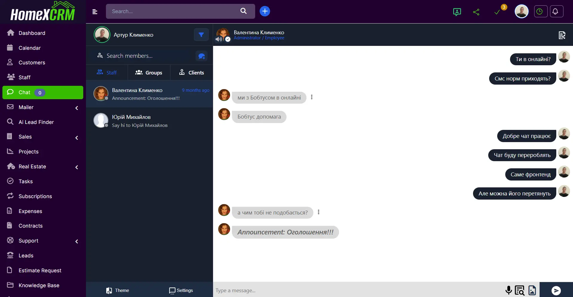 Розділ «Чат» у CRM системі призначений для внутрішньої комунікації між співробітниками компанії в режимі реального часу. Він дозволяє швидко обмінюватися повідомленнями, координувати робочі процеси, обговорювати задачі та отримувати важливі оголошення від адміністрації.